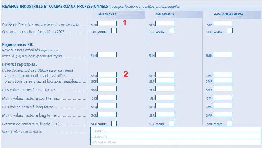Si tu exerces une activité commerciale ou de prestations de service BIC (artisanale ou commerciale), tu dois renseigner ton chiffre d’affaires dans les cases 5KO ou 5KP et dans la case 5DB le nombre de mois d’activité.