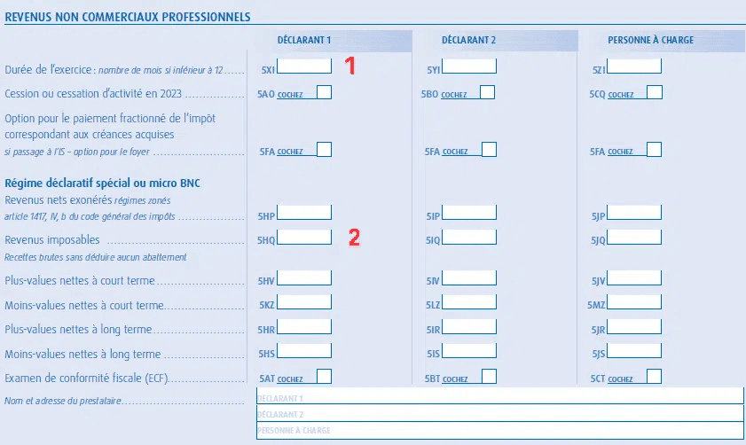 Tu exerces une profession libérale ou de prestation de service BNC (activité libérale), tu dois renseigner ton chiffre d’affaires dans la case 5HQ et indique dans la case 5XI le nombre de mois d’activité.